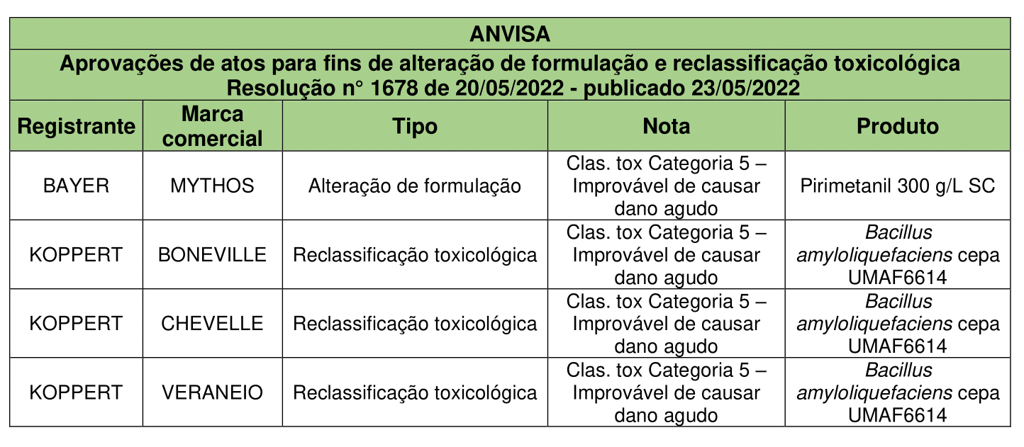 Aprovações de atos para fins de alteração de formulação e reclassificação toxicológica Resolução n° 1678 de 20/05/2022 – publicado 23/05/2022 Agrotóxicos Publicado em: 21 de junho de 2022