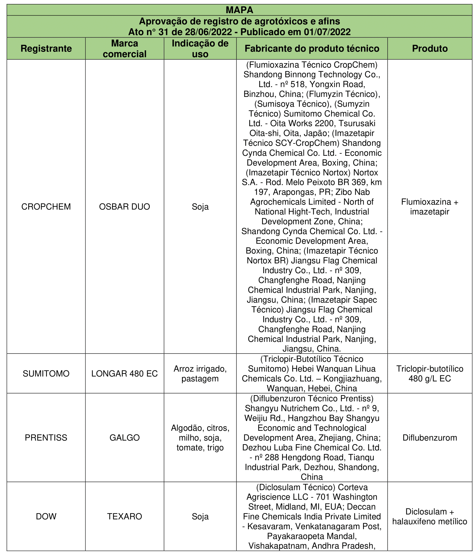 Aprovação de registro de agrotóxicos e afins – Ato n° 31 de 28/06/2022 – Publicado em 01/07/2022 Agrotóxicos, Defensivos agrícolas, Fertilizantes Publicado em: 4 de julho de 2022