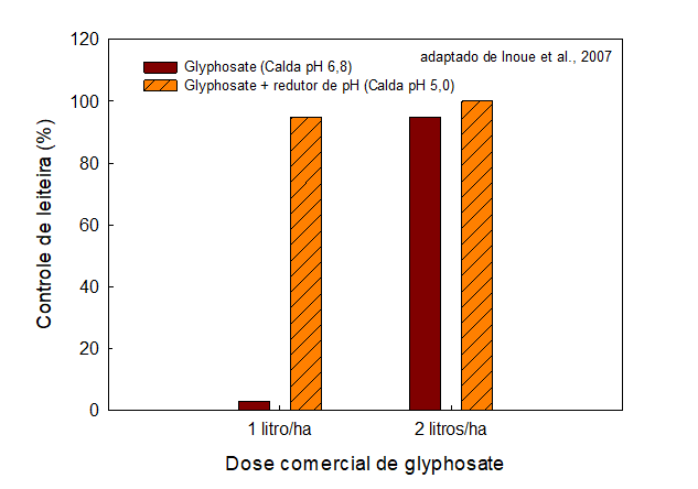 Redutores de pH são importantes principalmente em aplicações onde os herbicidas glifosato, 2,4-D e alguns graminicidas estão envolvidos. Na figura 3, verifica-se que a redução do pH da calda de 6,8 para 5,0 faz com que 1 litro de glifosato no pH 5,0 tenha o mesmo nível de controle que 2 litros de glifosato no pH 6,8.
