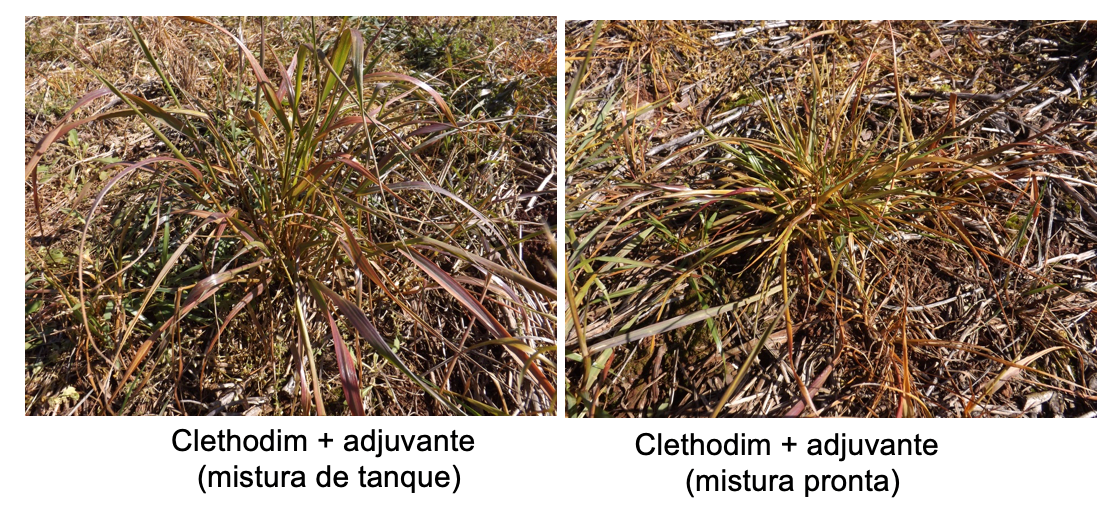 Na figura 2, verificamos a rapidez em que a nova formulação de clethodim controla plantas de azevém, em comparação com formulação convencional, onde se faz necessária a adição do adjuvante no momento de preparo da calda. Nas duas imagens, o único fator que varia é o tipo adjuvante, já que a quantidade do ingrediente ativo (clethodim) é a mesma.