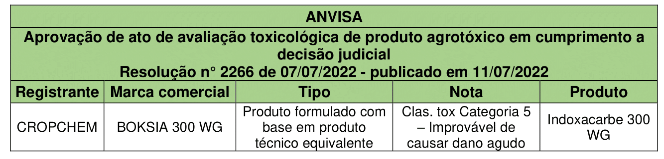 Aprovação de ato de avaliação toxicológica de produto agrotóxico em cumprimento a decisão judicial – Resolução n° 2266 de 07/07/2022 – publicado em 11/07/2022 Agrotóxicos Publicado em: 11 de julho de 2022