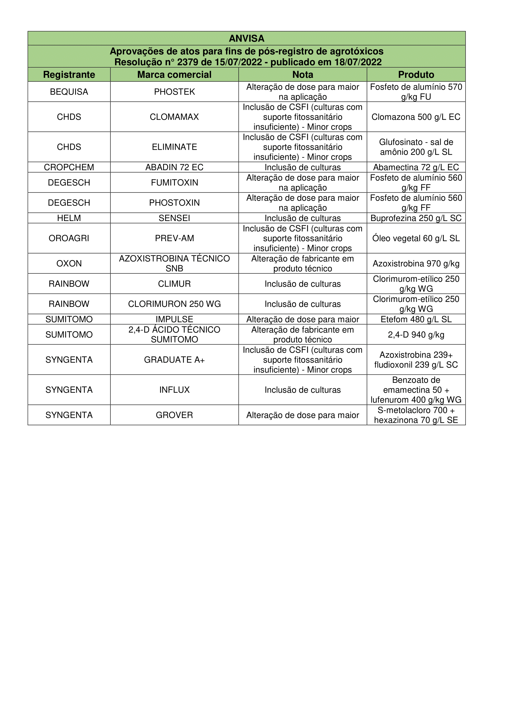 Aprovações de atos para fins de pós-registro de agrotóxicos – Resolução n° 2379 de 15/07/2022 – publicado em 18/07/2022 Agrotóxicos Publicado em: 18 de julho de 2022