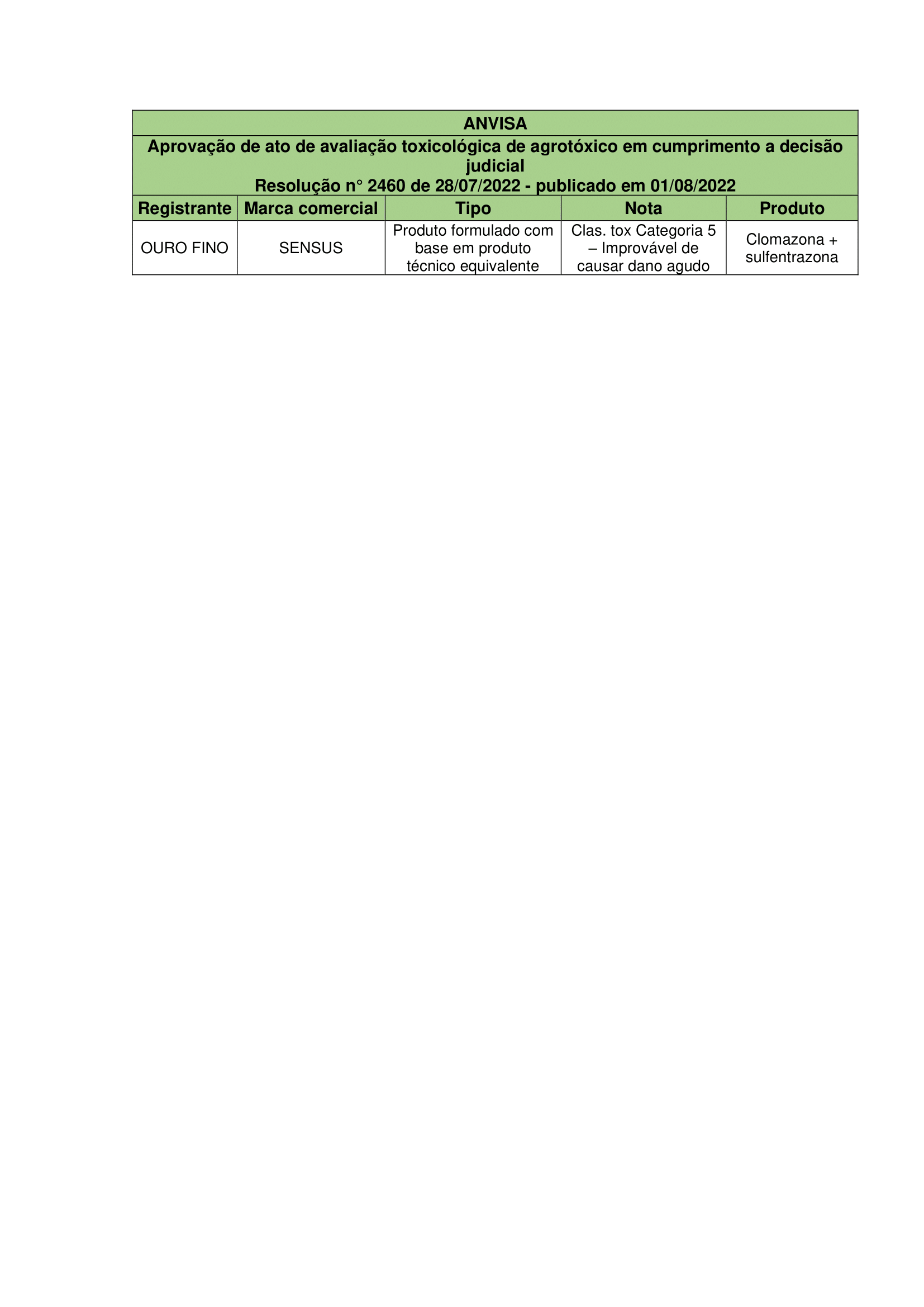 Aprovação de ato de avaliação toxicológica de agrotóxico em cumprimento a decisão judicial Resolução n° 2460 de 28/07/2022 – publicado em 01/08/2022 Agrotóxicos Publicado em: 15 de agosto de 2022