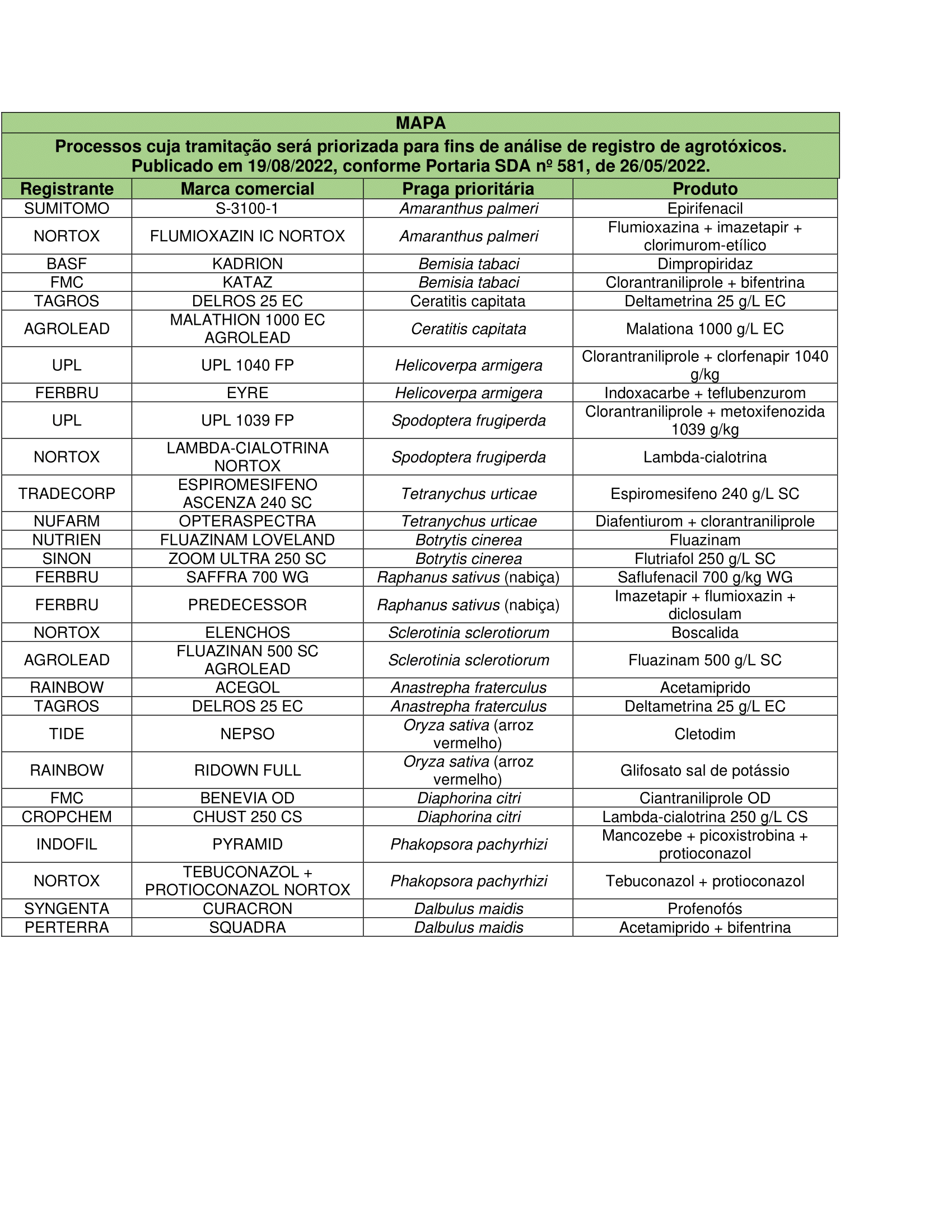 Processos que serão priorizados para fins de análise de registro de agrotóxicos Agrotóxicos Publicado em: 22 de agosto de 2022