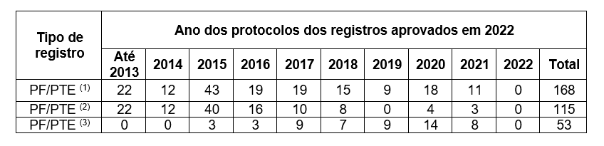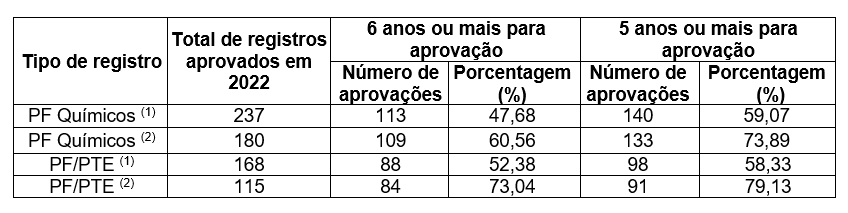 Em outro levantamento elaborado pela AllierBrasil, sobre as aprovações de registro em 2021, verificou-se que 60% dos registros de PF/PTE (1) demandaram 5 anos ou mais para aprovação, ante 59,07% de 2022. Isso significa que não houve variação no tempo necessário para aprovações desse tipo de produto nos últimos dois anos.