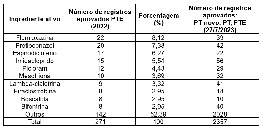 Em relação aos registros de produtos técnicos equivalentes (PTE), os 10 ingredientes ativos mais aprovados em 2022, de um total de 58, representam 47,6% dos PTE registrados, com destaque para a flumioxazina, com 8,12%, e o protioconazol, com 7,38%. Alguns desses ingredientes ativos têm mais de 40 registros de produtos técnicos aprovados. Outros têm poucas perspectivas de acesso ao mercado, seja porque suas fábricas fecharam, ou por motivo de reavaliação pelas agências regulatórias, por exemplo.