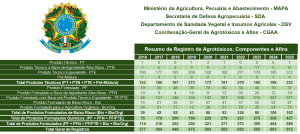 Em 2025, o Brasil atingiu novo recorde de aprovações de registros de agrotóxicos: 912, sendo 323 Produtos Técnicos (PT + PTN + PTE + Pré-Mistura), 427 Produtos Formulados Químicos (PF + PFN + PF/PTE) e 162 Produtos Biológicos.