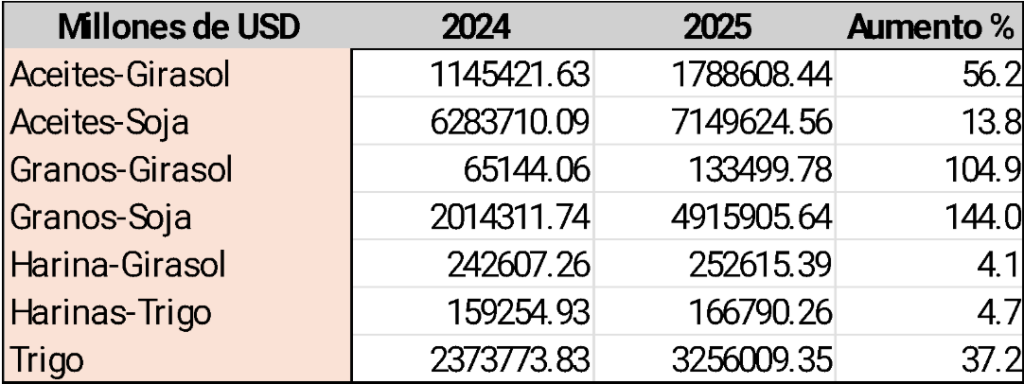 Exportaciones de aceites y granos de Argentina en 2024 y 2025 (en millones de dólares estadounidenses)