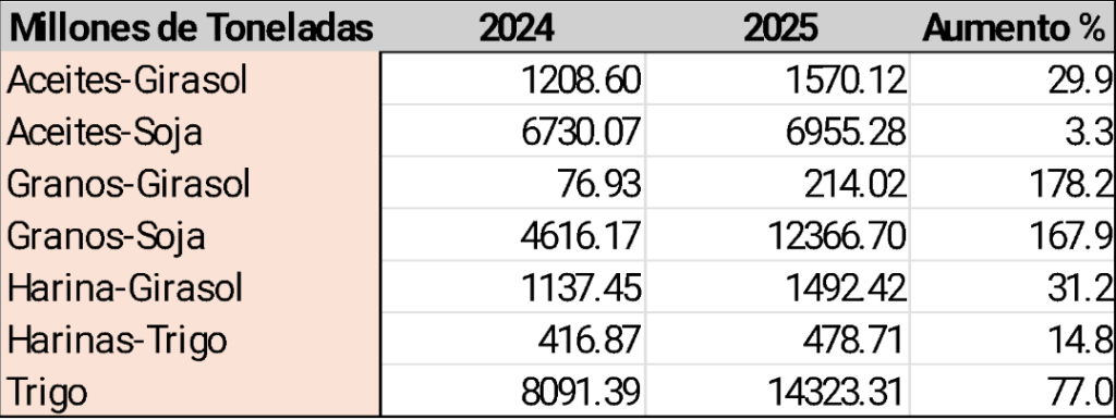 Exportaciones de aceites y granos de Argentina en 2024 y 2025 (en millones de toneladas)