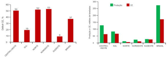 Figura 1: Déficit de capacidade estática de armazenagem (CE) por região (1a); produção e capacidade estática por região (1b).